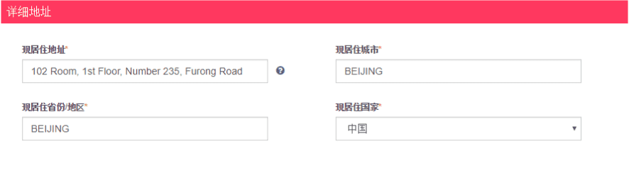 六、然后就是填写地址信息了,注意地址要用英文填写,如果不会写英文地址的话,用拼音也是接受的。住家地址一栏填街道号码楼层信息就行了,城市的话就填居住的城市,下面再填省份。定居海外的华人需要填写居住国的地址。